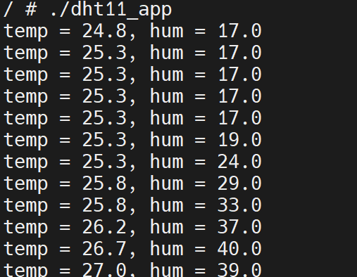 3)随后运行在目标板上的可执行程序,以验证模块功能或应用程序逻辑(./dht11_app)