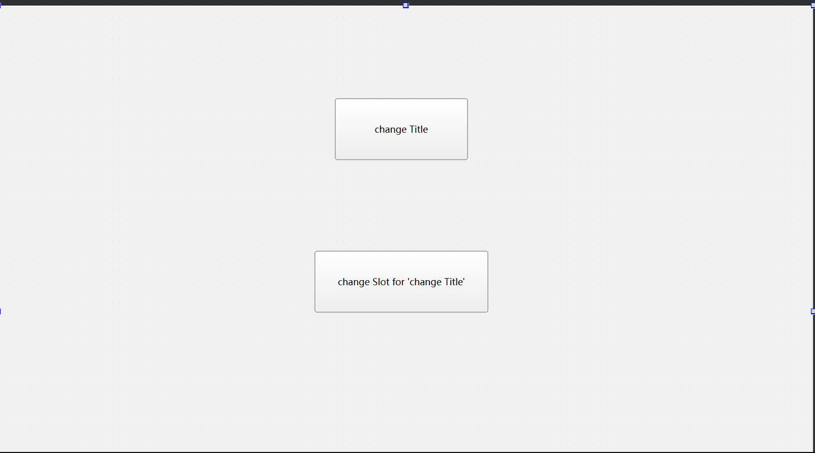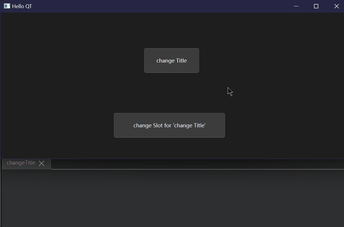 创建两个槽并连接其中一个槽Widget::Widget(QWidget *parent): QWidget(parent), ui(new Ui::Widget) {ui->setupUi(this);connect(ui->changeTitle, &QPushButton::clicked, this, &Widget::change_title_hello_world); }void Widget::change_title_hello_world(){ // 槽1this->setWindowTitle("Hello World");qDebug() << "changed title to hello world"; }void Widget::change_title_hello_qt(){ // 槽2this->setWindowTitle("Hello QT");qDebug() << "changed title to hello qt"; }