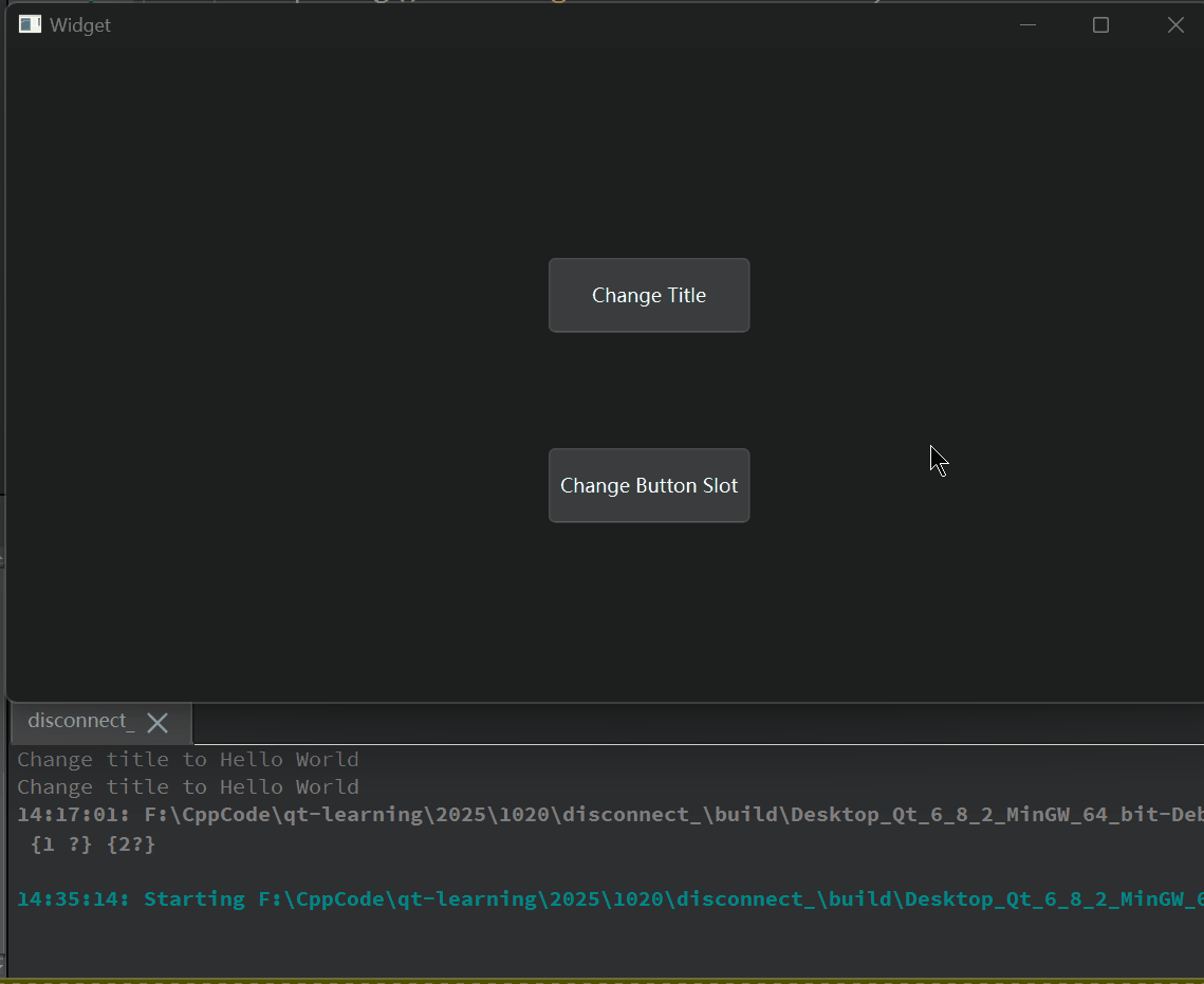 {if(disconnect(ui->change_title, SIGNAL(clicked()), this, SLOT(on_change_title_clicked()))){// 连接的是 Widget::on_change_title_clicked 且已经断开aconnect(ui->change_title, SIGNAL(clicked()), this, SLOT(changeTitleToHelloWorld()));qDebug()<<"Change to Hello world";}else{// 连接的是&Widget::changeTitleToHelloWorld, 需要手动断开该槽并连接disconnect(ui->change_title, SIGNAL(clicked()), this, SLOT(changeTitleToHelloWorld()));connect(ui->change_title, SIGNAL(clicked()), this, SLOT(on_change_title_clicked()));qDebug()<<"Change to Hello QT";}