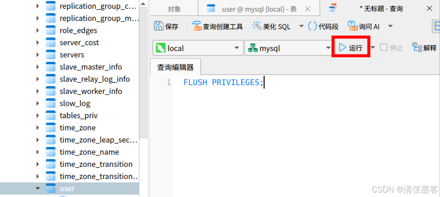 然后新建查询,输入"FLUSH PRIVILEGES;"更新权限