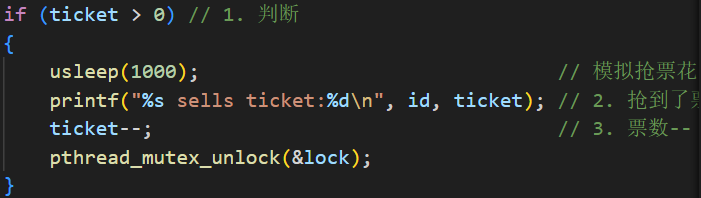 if (ticket > 0) // 1. 判断{usleep(1000); // 模拟抢票花的时间printf("%s sells ticket:%d\n", id, ticket); // 2. 抢到了票ticket--; // 3. 票数--pthread_mutex_unlock(&lock);}