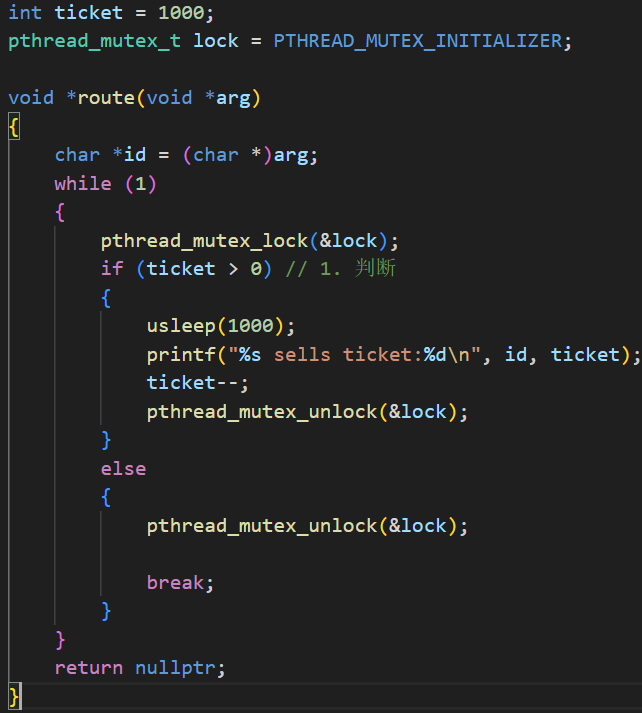 {char *id = (char *)arg;while (1){if (ticket > 0) // 1. 判断{usleep(1000); // 模拟抢票花的时间printf("%s sells ticket:%d\n", id, ticket); // 2. 抢到了票ticket--; // 3. 票数--pthread_mutex_unlock(&lock);}else{break;}}return nullptr;