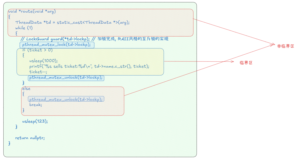 {ThreadData *td = static_cast<ThreadData *>(arg);while (1){LockGuard guard(*td->lockp); // 加锁完成, RAII风格的互斥锁的实现if (ticket > 0){usleep(1000);printf("%s sells ticket:%d\n", td->name.c_str(), ticket);ticket--;}else{break;}usleep(123);}return nullptr;
