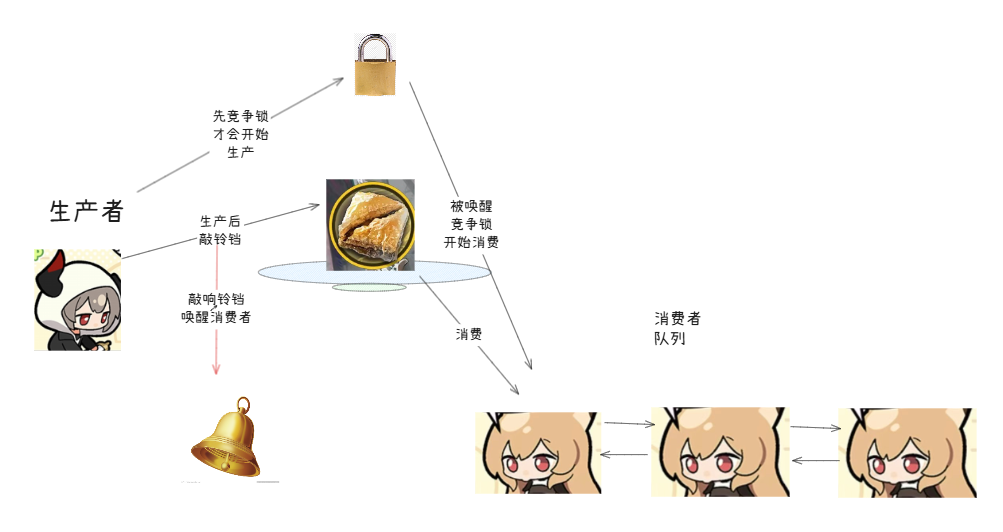 放食物的人,放完食物,敲一下铃铛;拿苹果的人,如果在申请所发现盘子中没有食物,就插入到等待队列中,当铃铛响起,就唤醒去竞争锁拿食物。