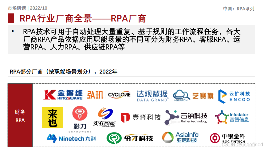 根据《2022年中国RPA市场探析报告》,国内头部RPA厂商(如金智维、弘玑Cyclone、来也科技等)在产品创新和技术融合方面表现出更高的成熟度,而中腰部厂商则更专注于垂直领域(如电商、物流),技术栈相对单一,创新深度和生态支持较为有限。具体差距可能体现在:新发票字段标准上线后,有的厂商当天就能自动适配,有的则要等到下一季度。