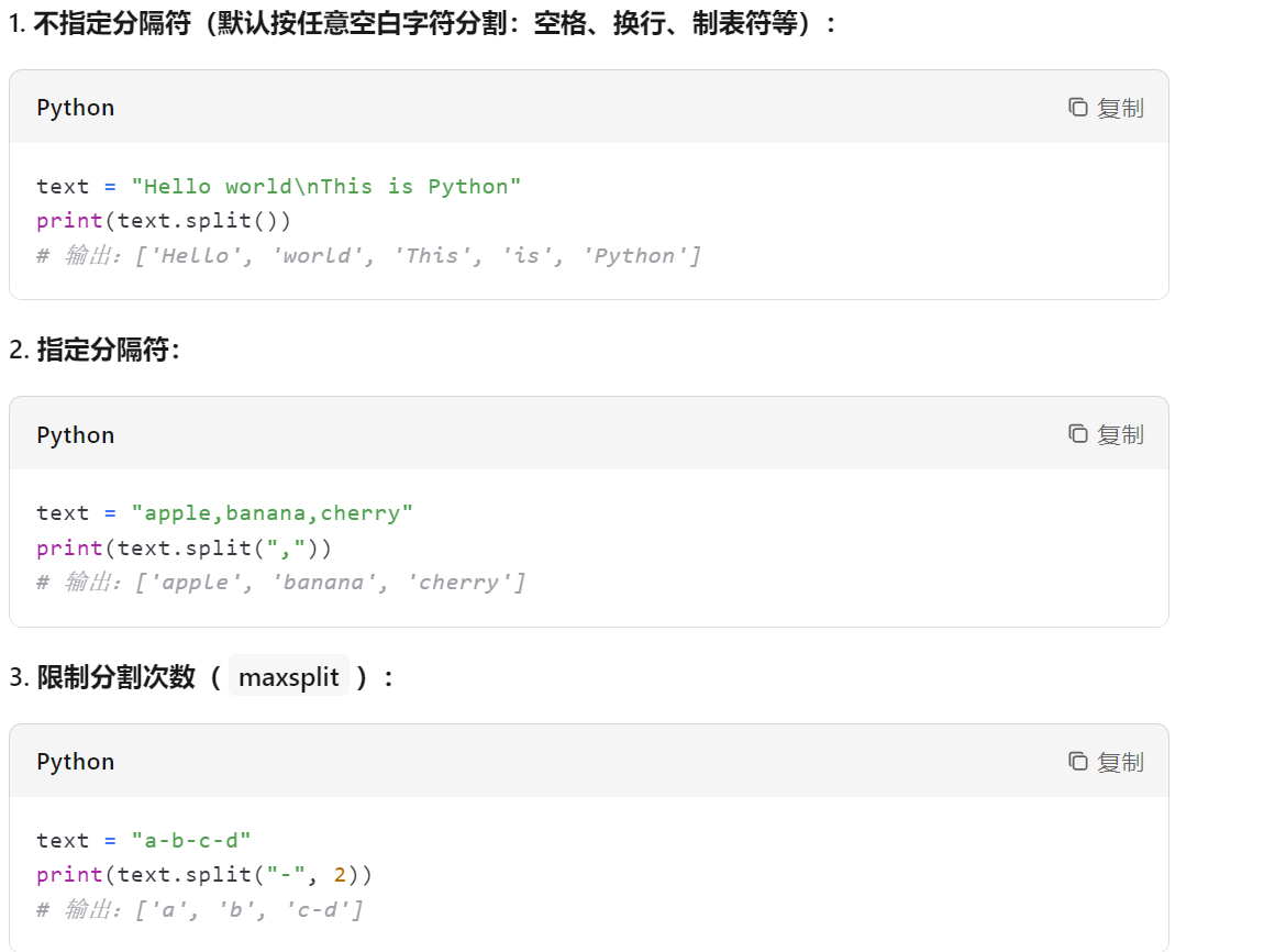 .split():他其实是这么个东西:字符串.split(sep=None, maxsplit=-1),括号中有两个参数,一个是分隔符,一个是分割的次数。前面的字符串是分割的对象。