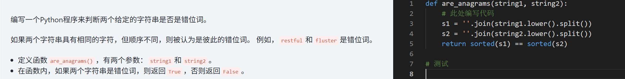 我们来看一下这道题(其中出现了一些我还没有学到的东西,但是今天不想听课,所以就边做题边学习吧),原本看到这道题是想用FOR循环来尝试一下的,但是感觉既然是python应该会有更加方便的解法,所以去搜了一下AI(搜AI也是状况百出,搜的时候发现python是不会自动忽略掉空格的,他会把空格当成一个普通的字符来记录,所以我们需要通过命令将他除去)