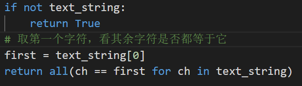 这是一个判断字符串中所有的字符是否相等的代码,if not语句会在text_string 为空是执行下面的语句。最后的return 那句是一个生成器表达式,可以后面会讲,我们先不做过多的研究。先了解一下all这个东西,他是在括号中的东西全为真时返回true,但凡有一个是假则返回false。