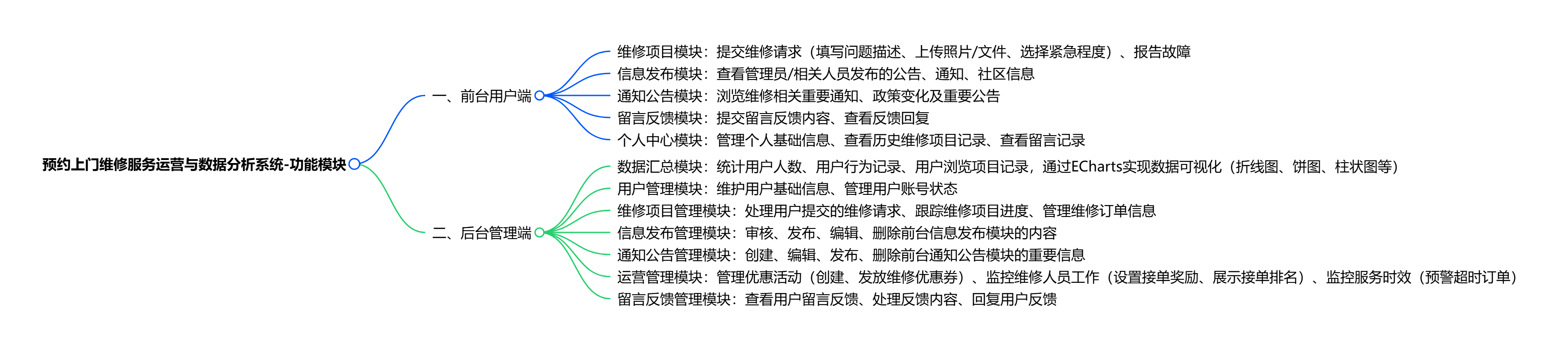- 后台管理端:核心功能含七大模块,数据汇总模块统计用户人数、用户行为记录、浏览项目记录;用户管理模块负责用户信息维护;维修项目管理模块对用户提交的维修请求进行处理;信息发布管理、通知公告管理模块分别管控前端对应模块的内容发布;运营管理模块支撑优惠活动、维修人员激励、服务时效监控等运营工作;留言反馈管理模块处理用户反馈信息,同时系统通过 ECharts 实现数据可视化,辅助运营决策。