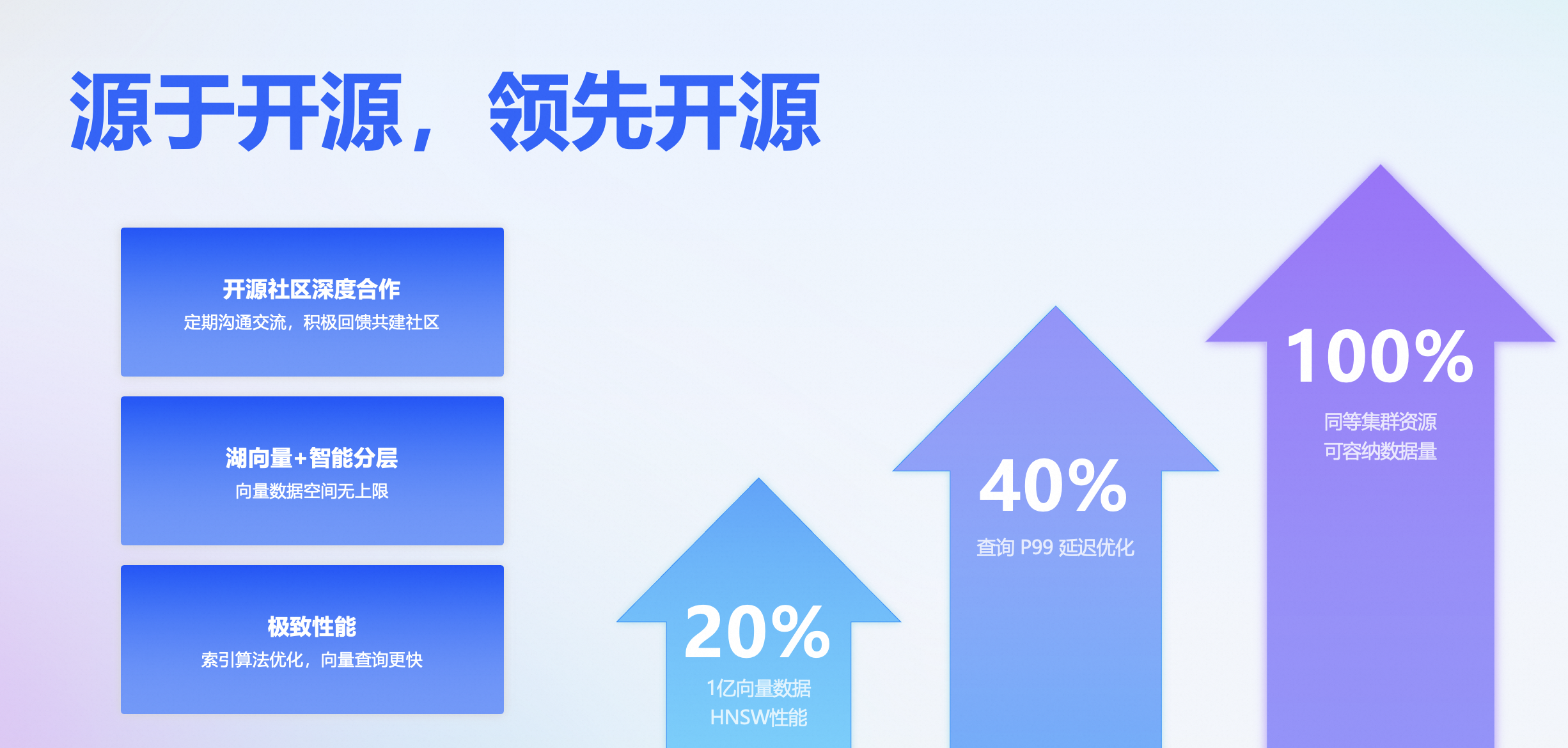 大规模向量检索性能相比开源版本提升 20% 以上,P99 延迟降低 40%