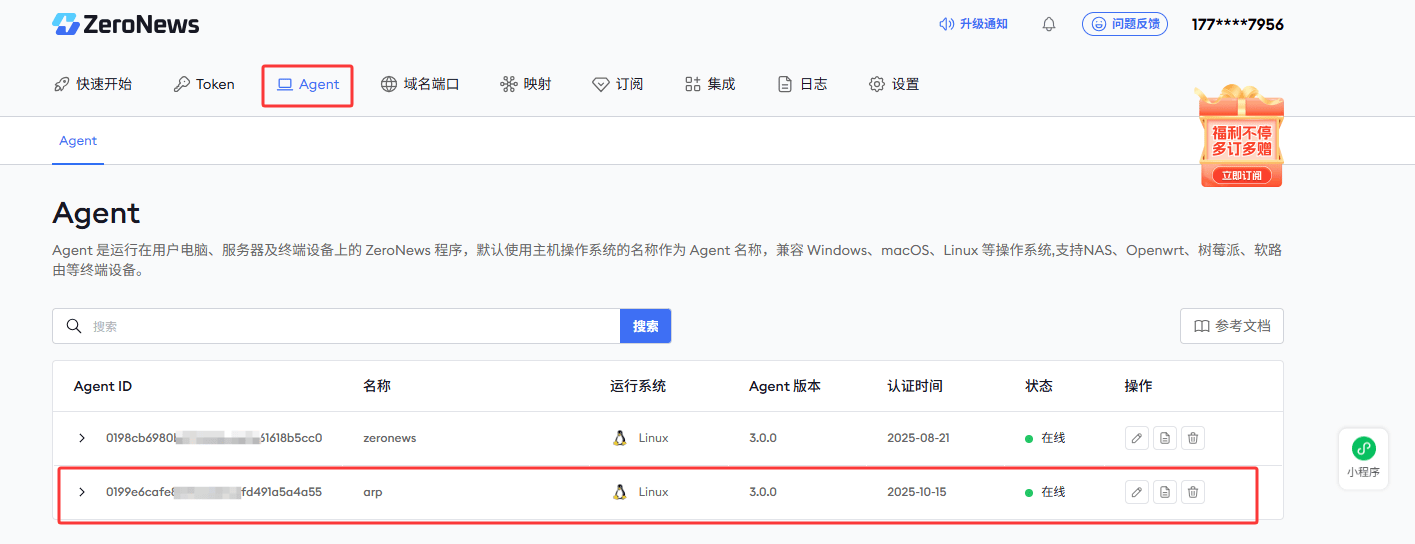 1. 安装完成后,回到 ZeroNews 平台,Agent已经显示在线。