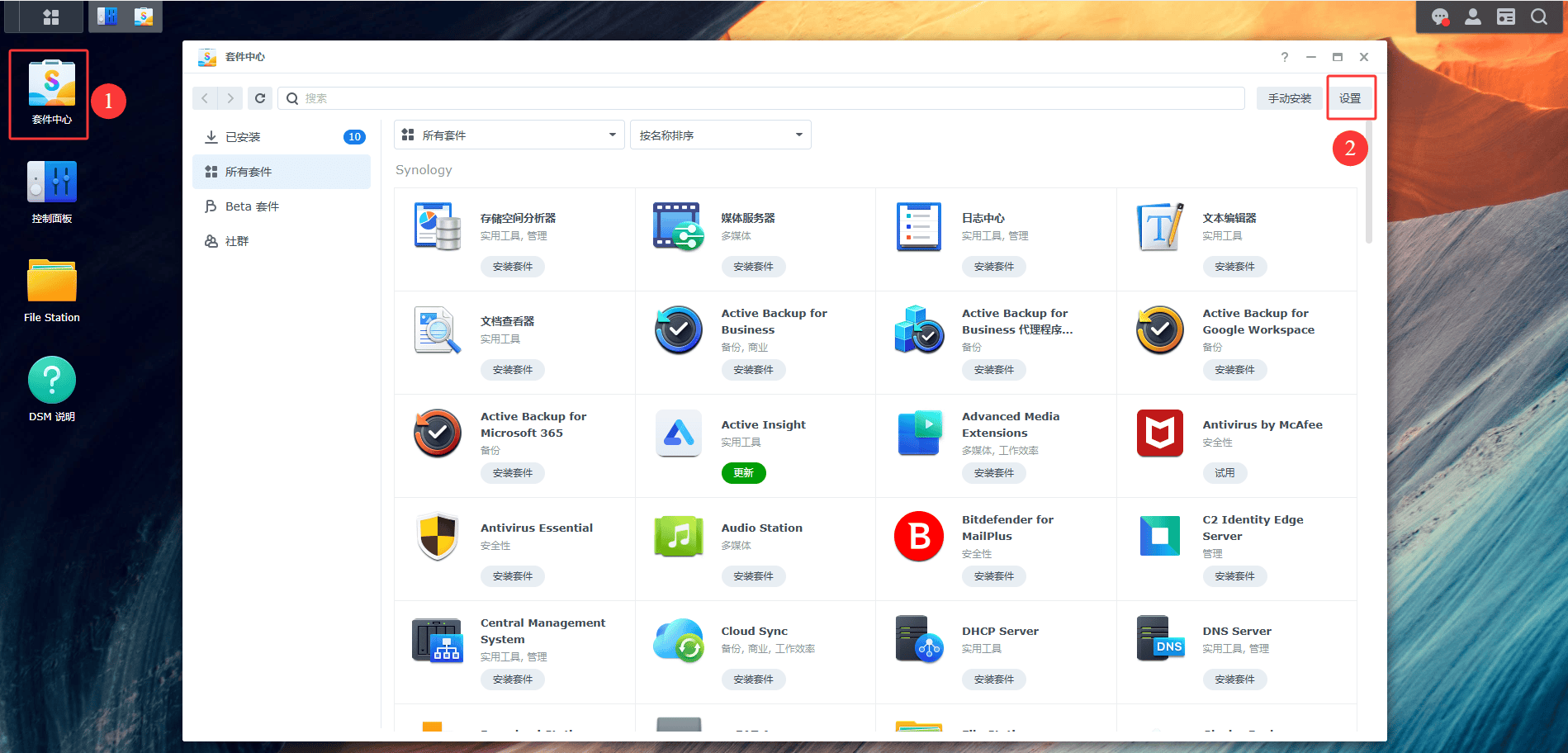 1. 打开群晖 DSM 系统,进入 「套件中心」。