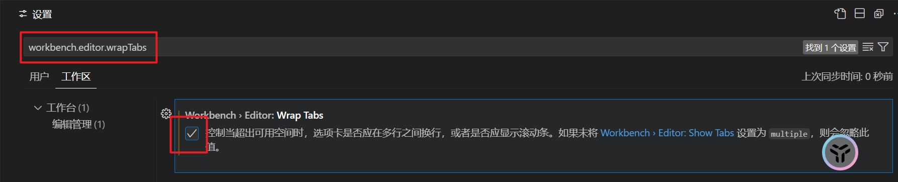 3、输入workbench.editor.wrapTabs,勾选该设置项即可