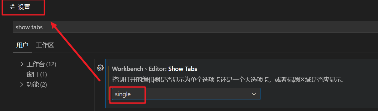 1、点击文件---首选项---设置,或者左下角也可以打开设置页面,搜索show tabs,然后找到Workbench > Editor:Show Tabs,勾选该项