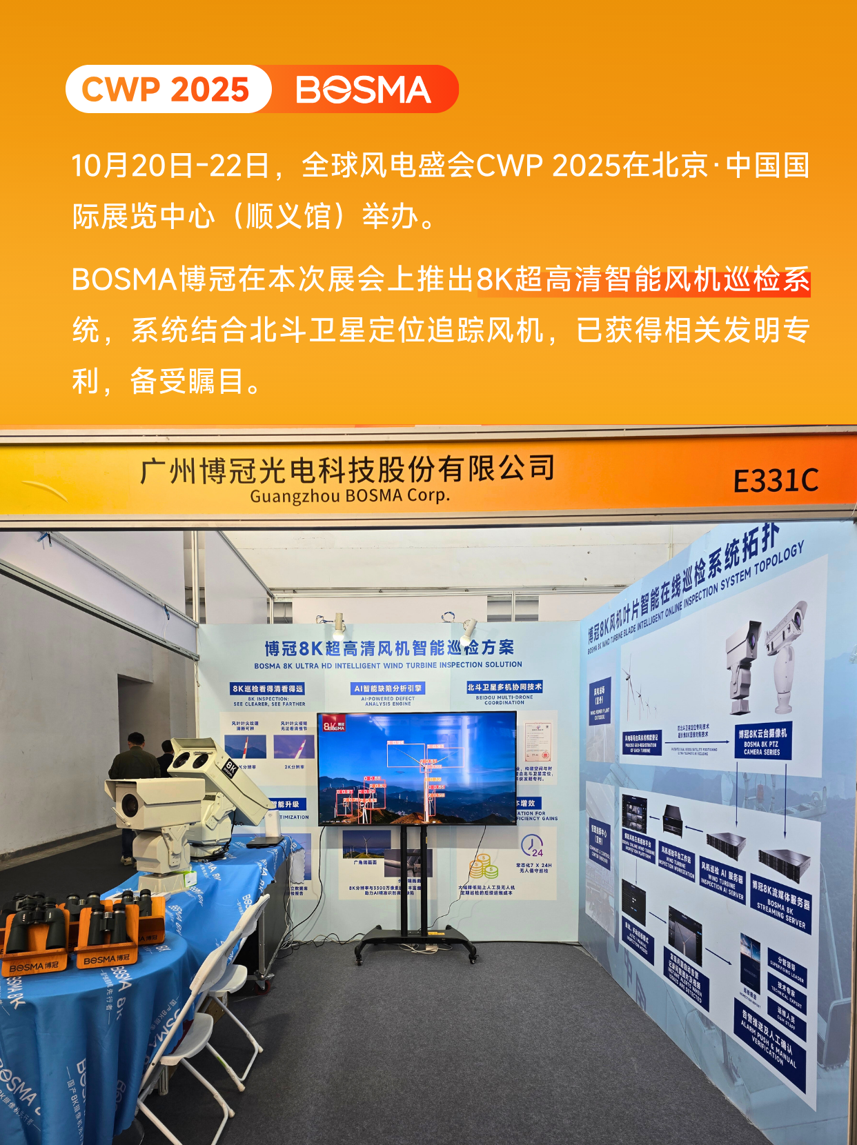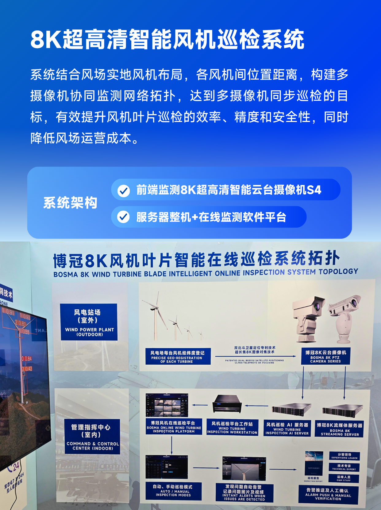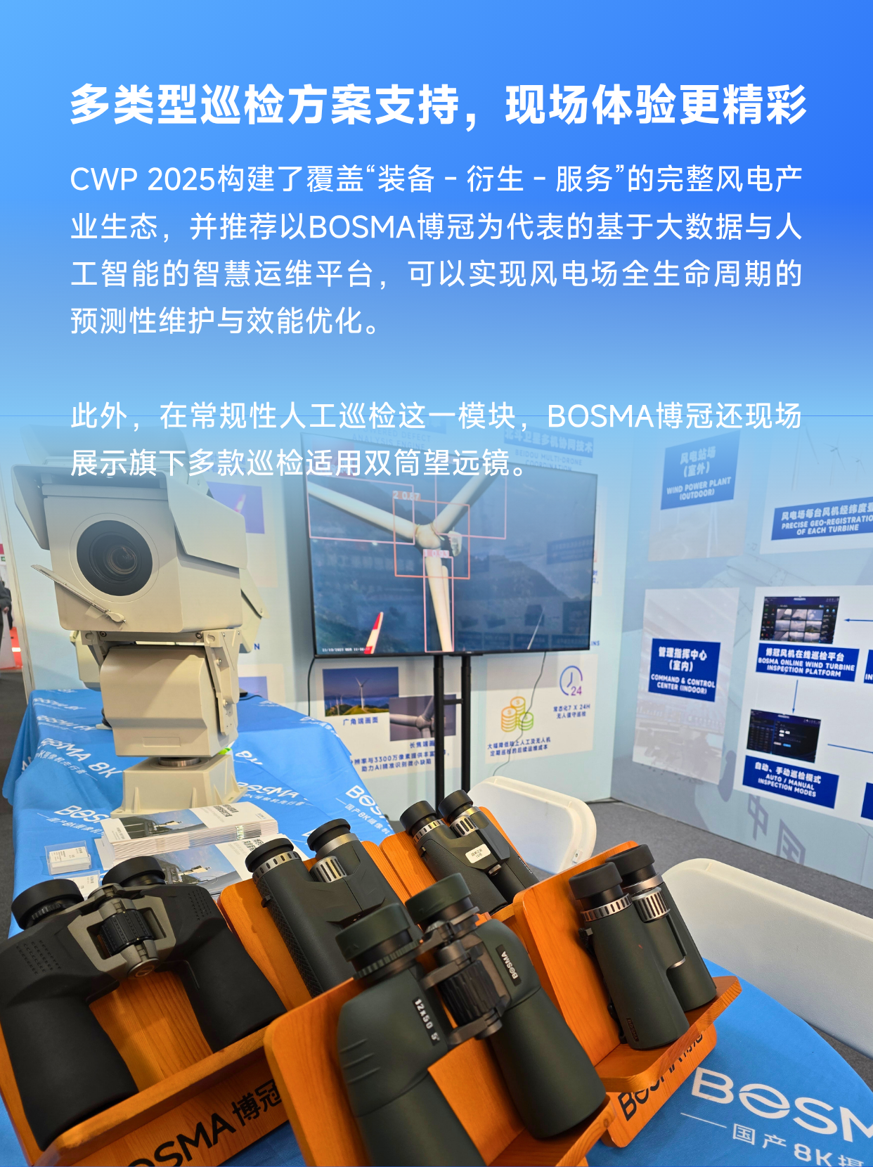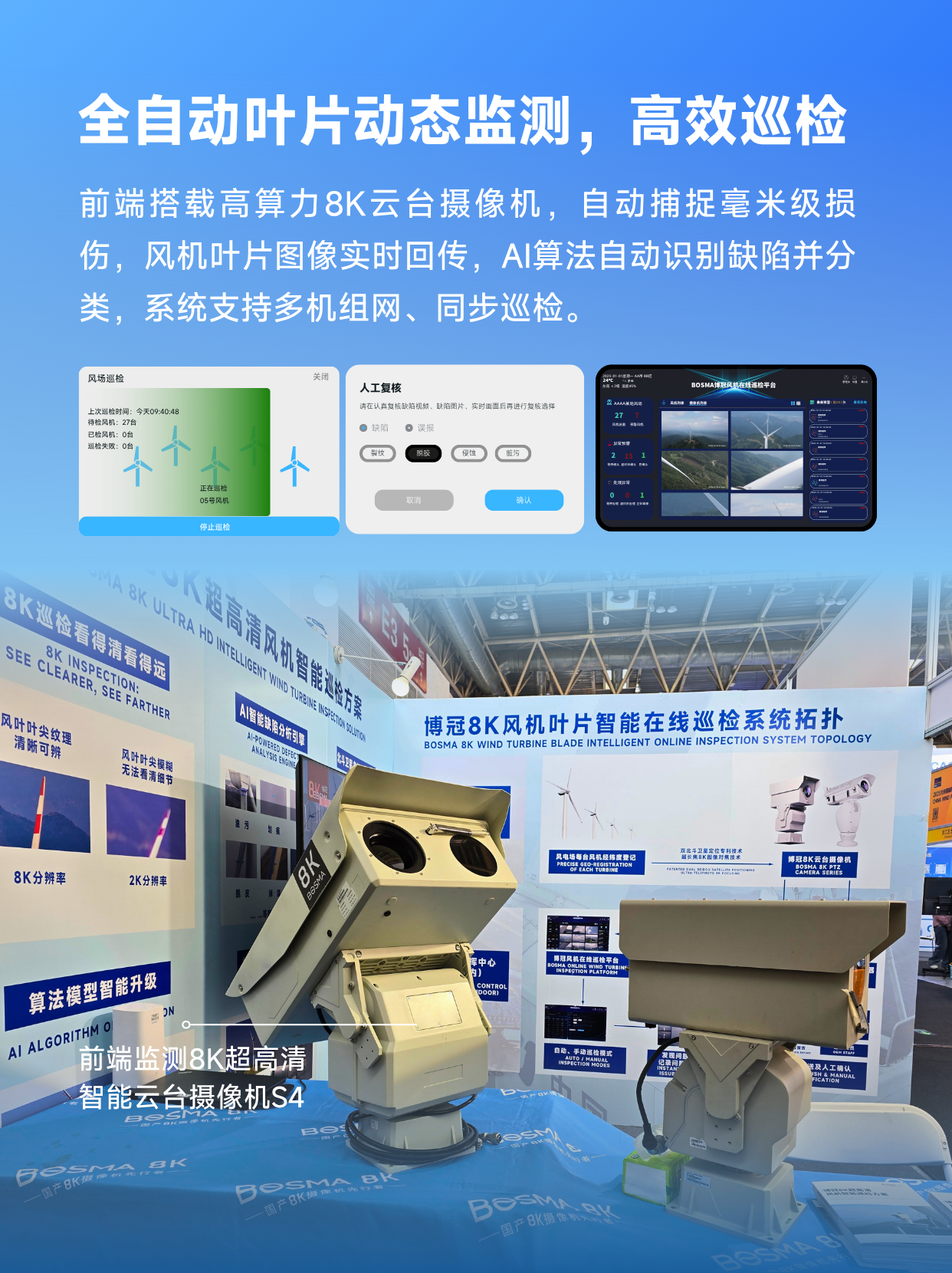 作为国产8K摄像机先行者,BOSMA博冠深耕行业多时,自主开发出基于大数据与人工智能的智慧运维平台,实现风电场风机叶片全生命周期的预测性维护与效能优化,现场展示旗下针对风电风机巡检的专项解决方案——软硬件一体【8K超高清智能风机巡检系统】。