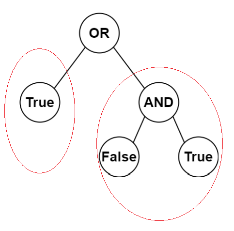 我们需要先遍历根的左树,然后遍历树的右树,根据返回值和根的逻辑运算符计算结果。