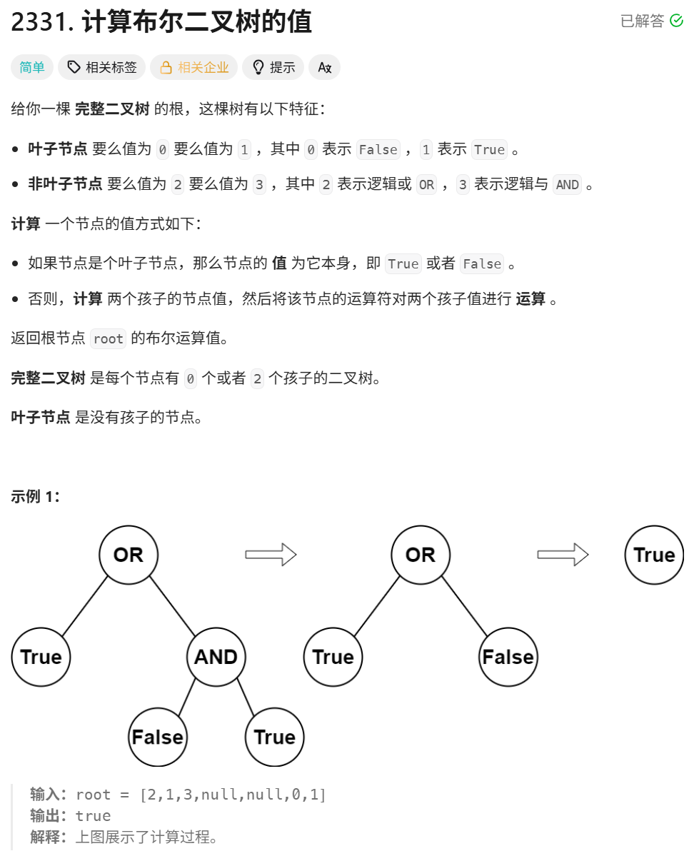 public:bool evaluateTree(TreeNode* root){if(root->left == nullptr && root->right == nullptr) return root->val;bool left = evaluateTree(root->left);bool right = evaluateTree(root->right);return root->val == 2 ? left || right : left && right; }