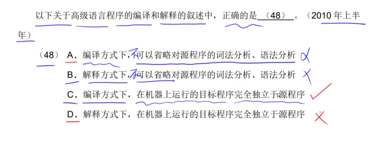 - 编译器:翻译源程序时生成独立的目标程序,机器上运行的是与源程序等价的目标程序,源程序和编译程序都不再参与目标程序的运行过程