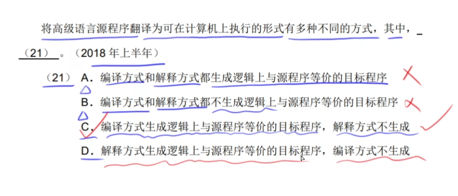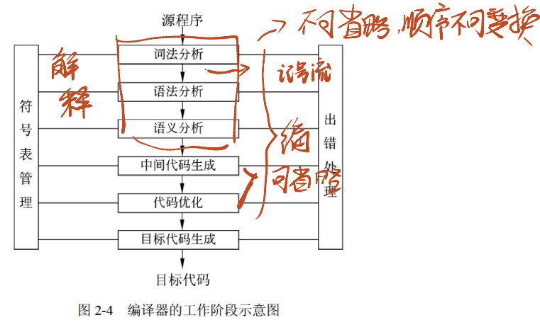 - 解释器:翻译源程序时不生成独立的目标程序,解释程序和源程序都要参与程序的运行过程中