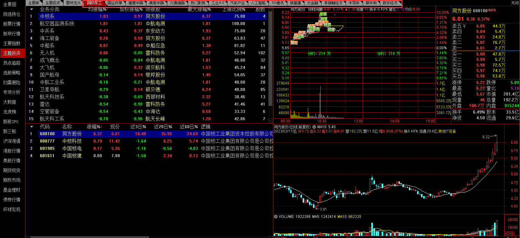 主题投资的栏目还展示了国防军工、国企改革、健康中国、美丽中国、交通强国、热门影视、工业4.0、汽车产业、人工智能、5G通讯、新基建、大金融、非接触经济、半导体、碳中和、数字经济等重点主题题材。