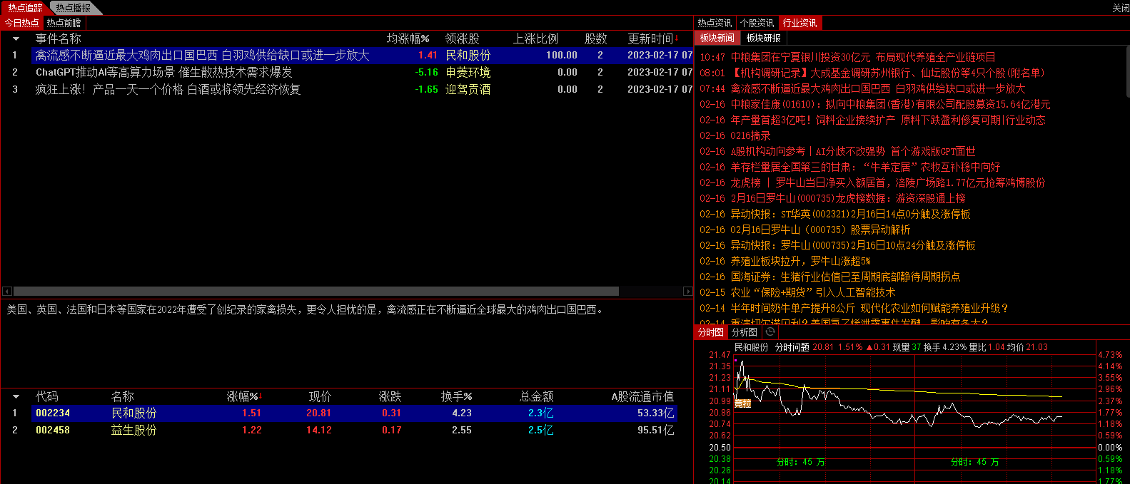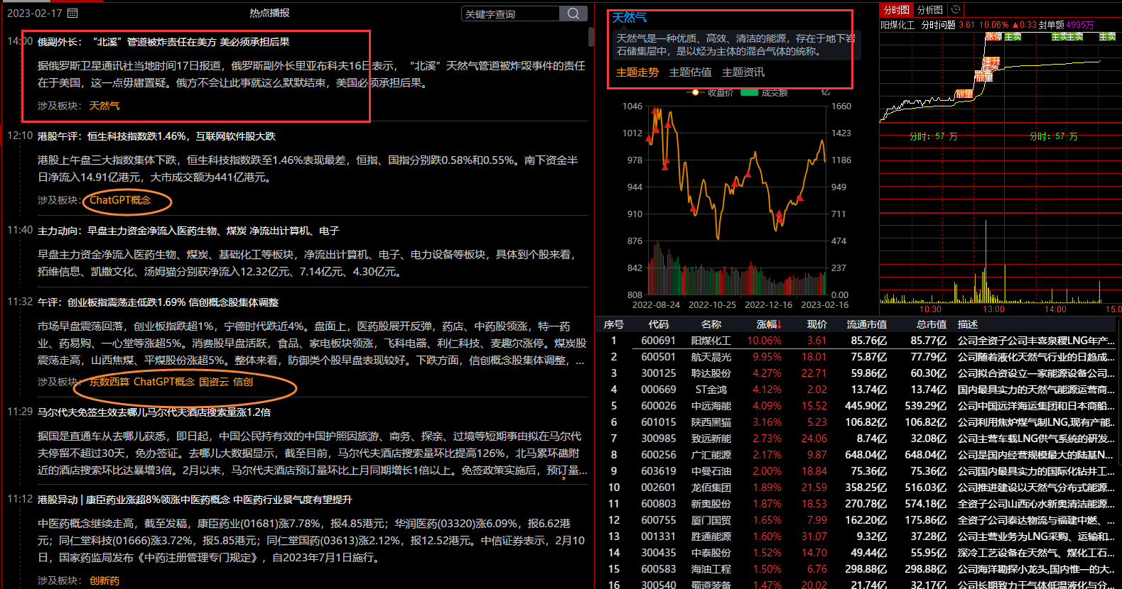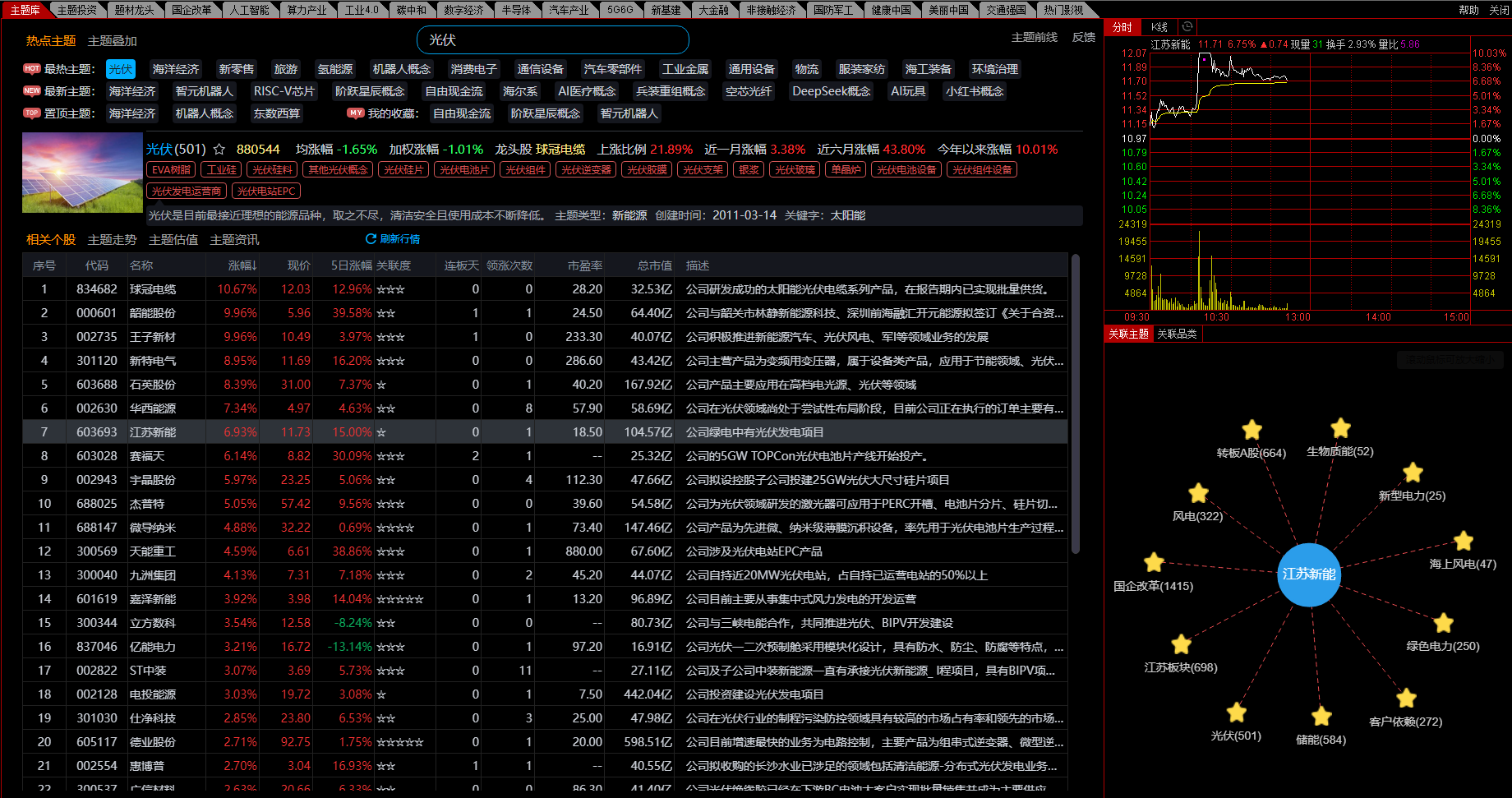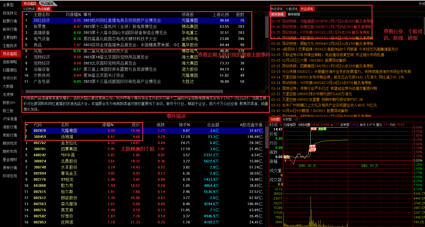 界面如下图,左上部分可以查看近期与主题相关的重要事件,如产业博览会、展览会、技术大会等;右上部分查看行业、个股有关资讯、新闻和研报。下半部分是主题内包含的个股,行情即走势图。