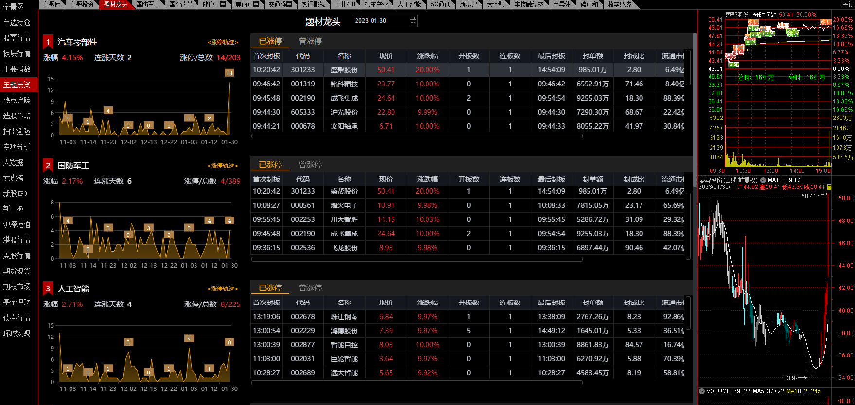题材龙头界面列出近期的热点主题题材前十名,展示主题的涨幅情况,对应主题的涨跌停个股列表。选择日期,可指定一查看不同时期下的主题涨跌历史数据。