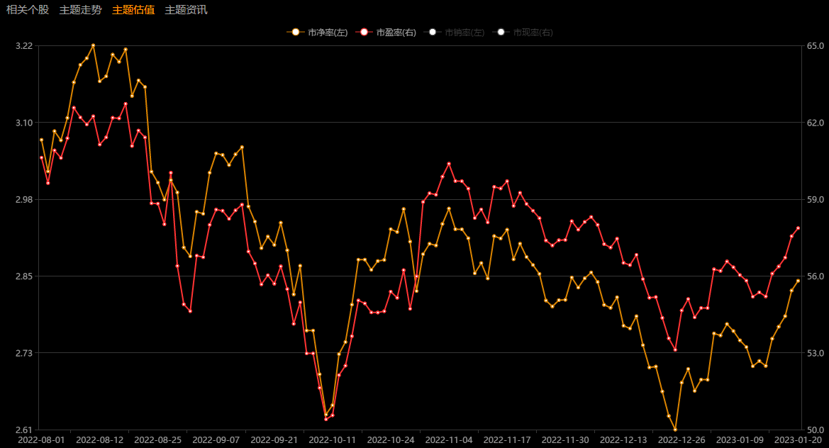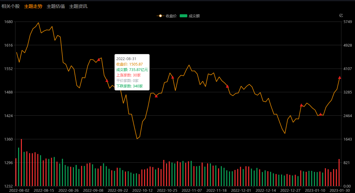 主题库包括相关个股、主图走势、主题估值、主题资讯四个栏目。可以分布查看主题关联的个股列表,主题的整体走势行情,主题的估值走势和主题的题材资讯内容。