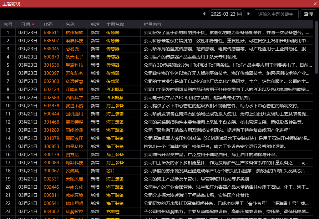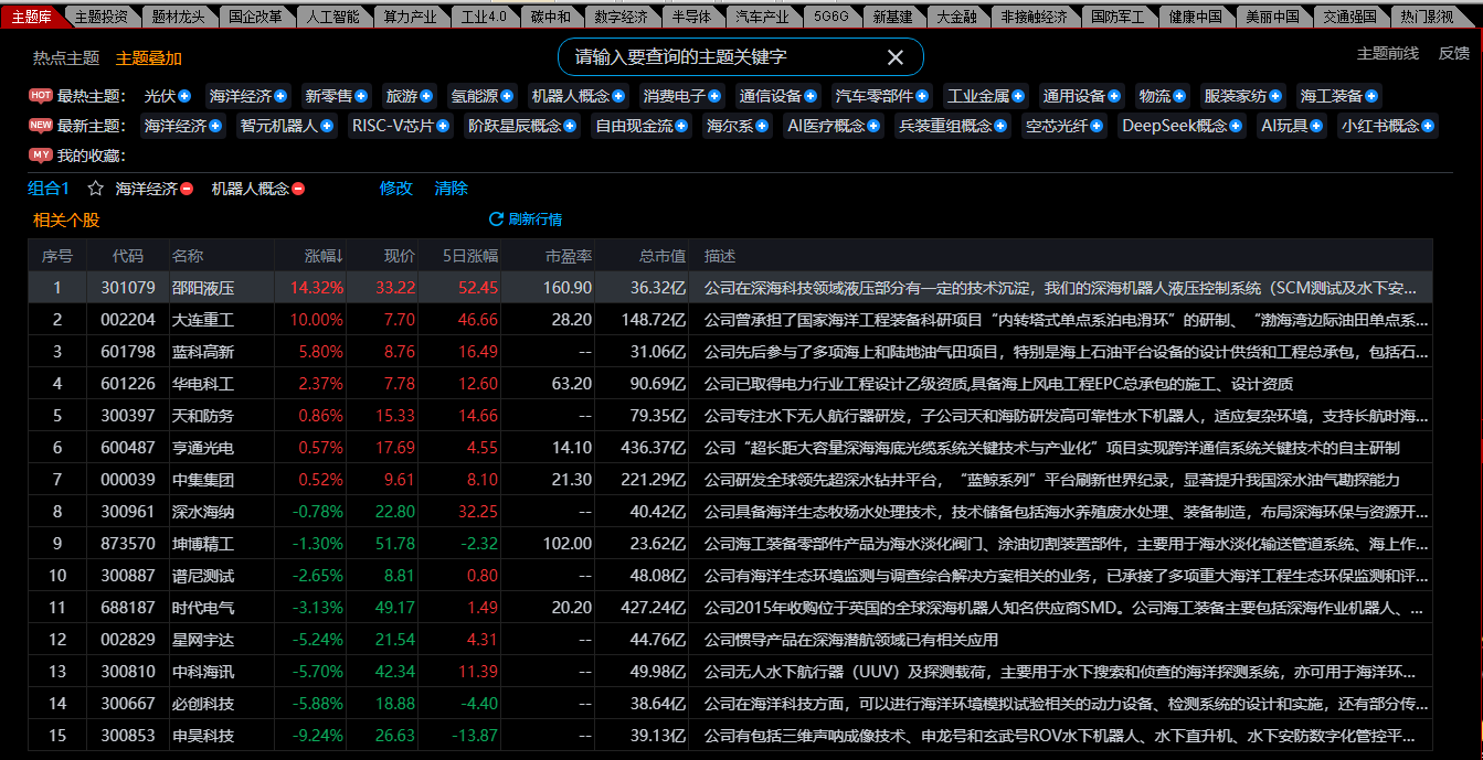 主题库界面,点击“搜索”可以输入主题名称关键字,快速定位到需要看的主题概念的行情数据。