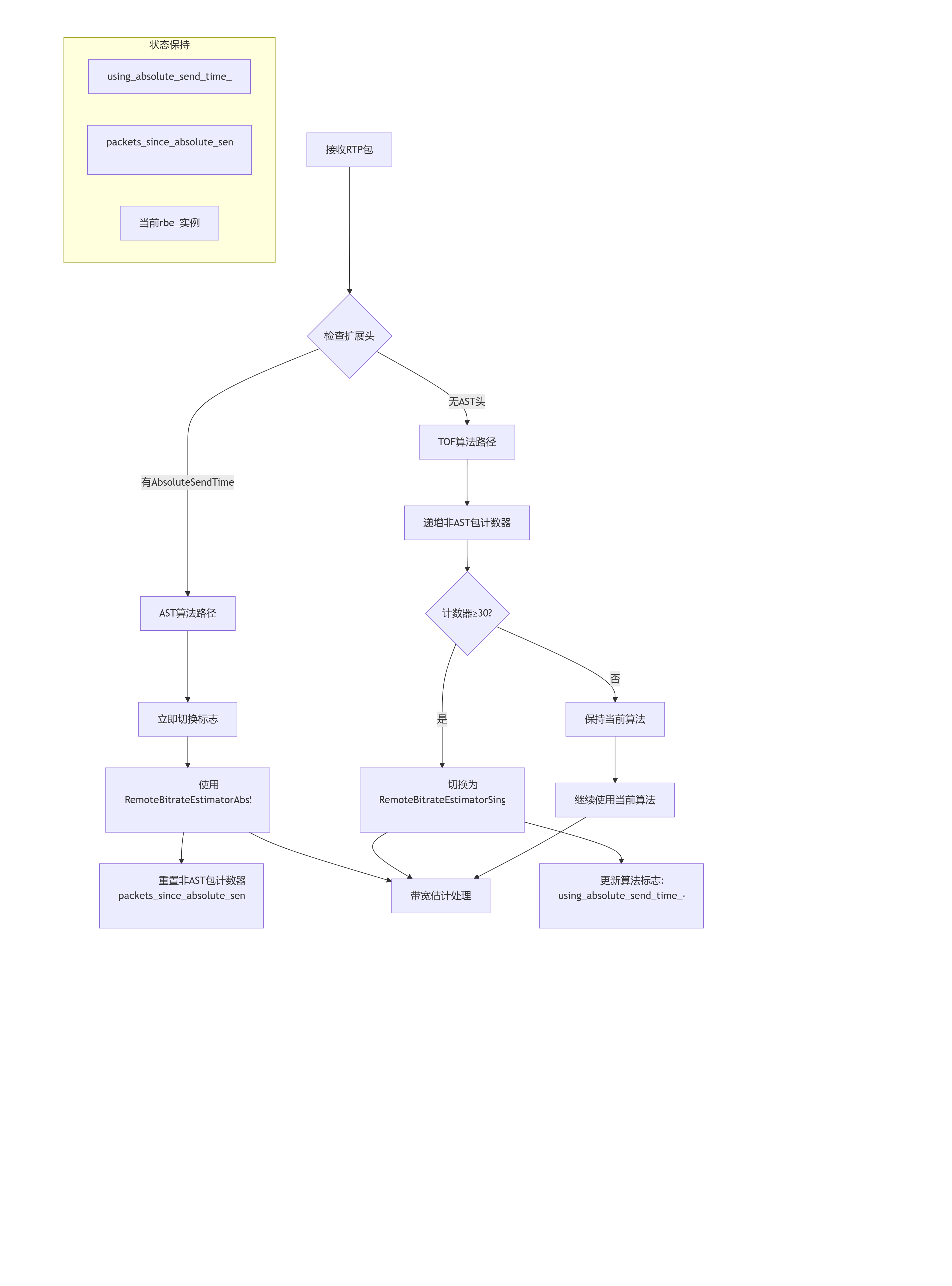 void ReceiveSideCongestionController::PickEstimator(bool has_absolute_send_time) {if (has_absolute_send_time) {// 发现AST扩展头,立即切换到AST算法if (!using_absolute_send_time_) {RTC_LOG(LS_INFO) << "切换到绝对发送时间RBE算法";using_absolute_send_time_ = true;rbe_ = std::make_unique<RemoteBitrateEstimatorAbsSendTime>(&remb_throttler_, &clock_);}packets_since_absolute_send_time_ = 0;} else {// 没有AST扩展头,等待一定包数后切回TOF算法if (using_absolute_send_time_) {++packets_since_absolute_send_time_;if (packets_since_absolute_send_time_ >= kTimeOffsetSwitchThreshold) {RTC_LOG(LS_INFO) << "切换到传输时间偏移RBE算法";using_absolute_send_time_ = false;rbe_ = std::make_unique<RemoteBitrateEstimatorSingleStream>(&remb_throttler_, &clock_);}}} }