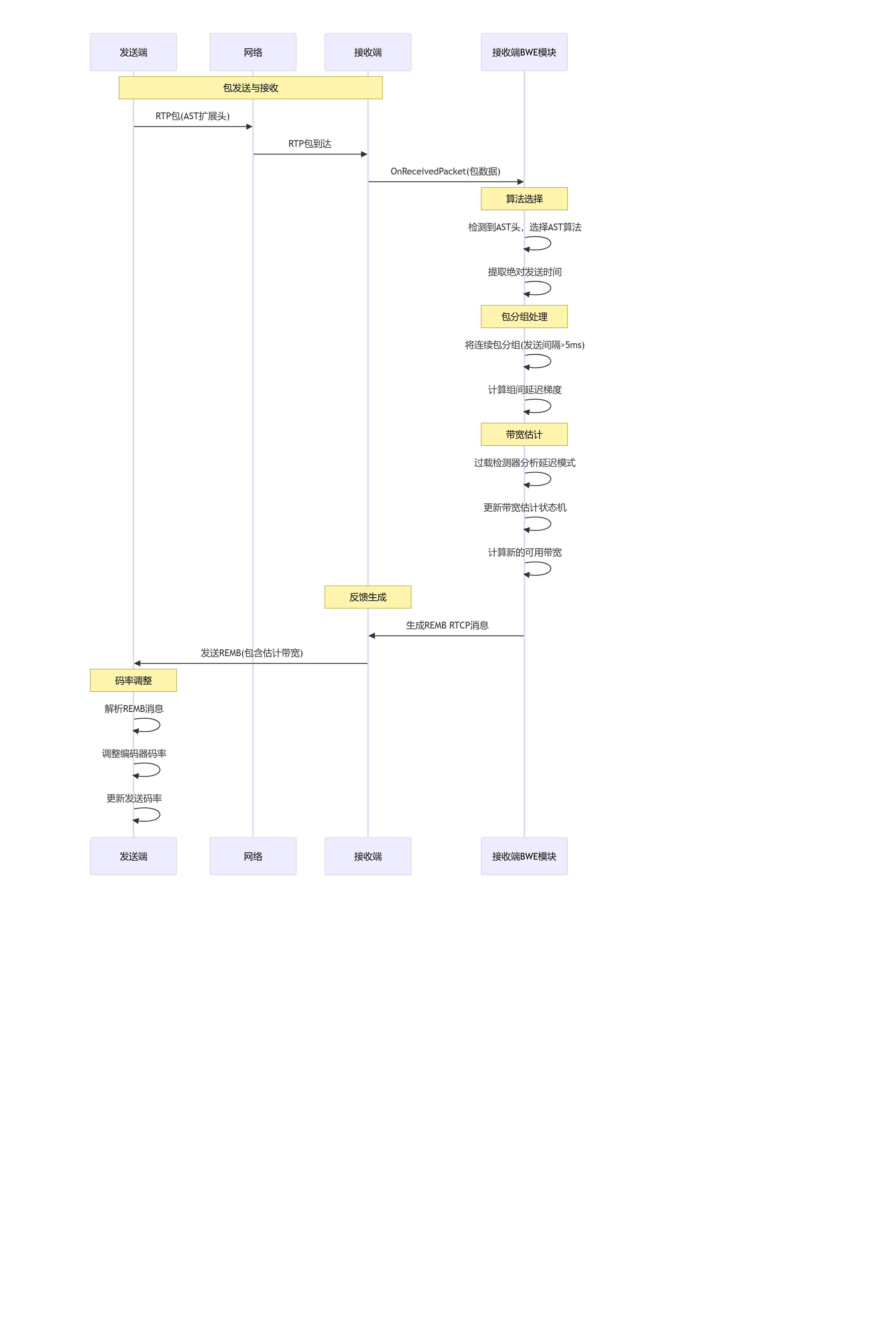 1. 收到视频RTP包 → 检查扩展头 2. 有AbsoluteSendTime → 选择AST算法 3. 调用rbe_->IncomingPacket()进行本地估计 4. 定期MaybeProcess()生成REMB反馈 5. 通过remb_throttler_发送码率限制