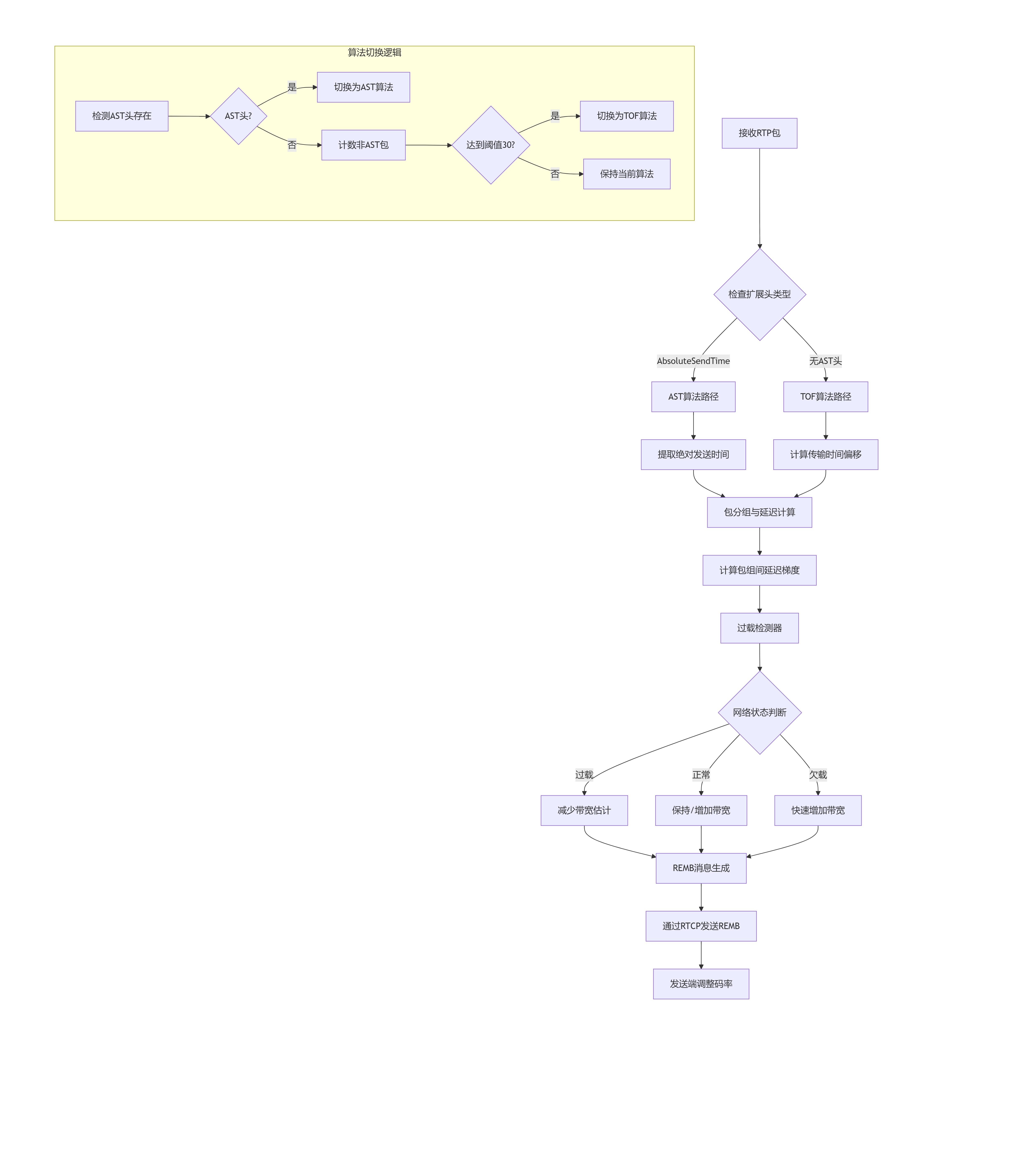 // 两种估计算法: // 1. AbsoluteSendTime算法:基于绝对发送时间扩展头 // 2. SingleStream算法:基于传输时间偏移 // 算法根据数据包中的扩展头动态切换