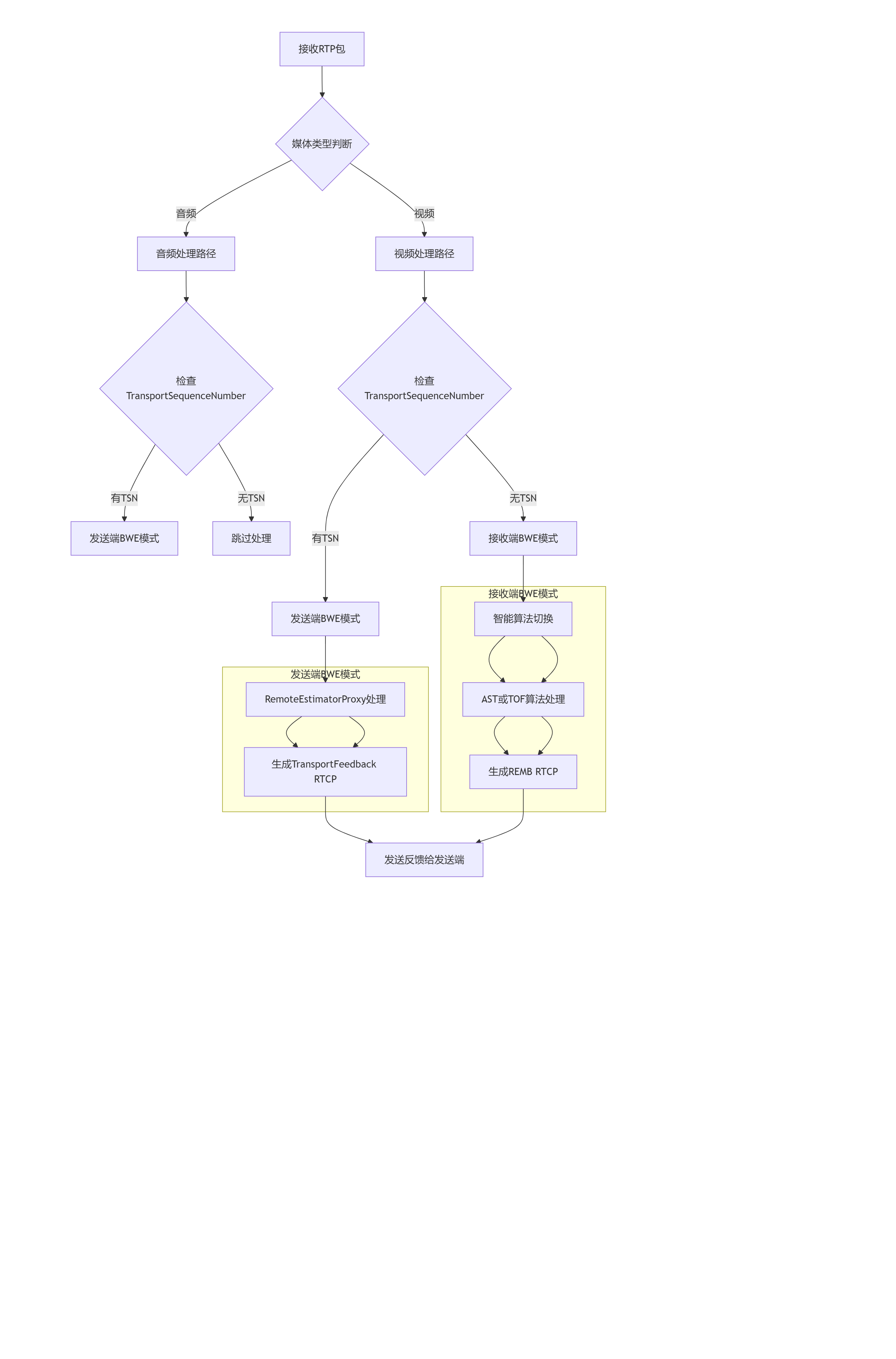 // 统一处理发送端BWE和接收端BWE // 根据TransportSequenceNumber存在性自动路由 // 音频流特殊处理:仅支持发送端BWE