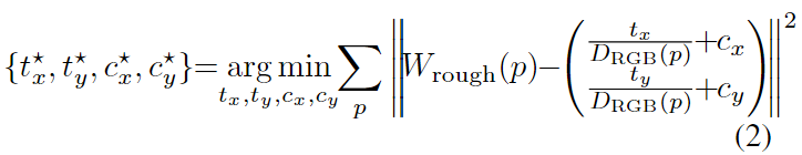 在第二阶段,我们通过使用轻量级融合 CNN 结合 ToF 传感器获得的深度图像来细化流。特别是,我们首先从ToF相机的角度扭曲深度图像,用DToF表示,到RGB相机DRGB的角度,即DRGB = DToF◦Wrough。对于弱校准模块,我们可以通过解决以下最小二乘问题,轻松地估计ToF振幅图像(初始校正后)和RGB图像之间的一组新的相机参数{t百科x, t百科y, c百科x, c百科y}