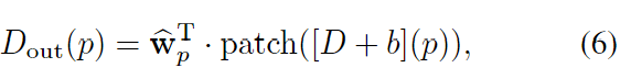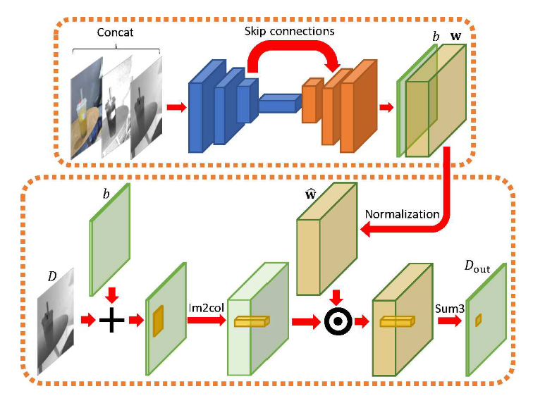 其中Dout是输出深度,Dout(p)是它的第p个像素,patch(D(p))∈Rk2表示以像素p为中心的D的向量化补丁。像素级核wp∈Rk2和偏置b∈Rh×w是KPN的输出。换句话说,KPN 输出是一个大小为 h × w × (k2 + 1) 的 3-D 体积。我们将提出一种改进的KPN用于ToF深度图像细化,这在两个主要方面与(4)不同。