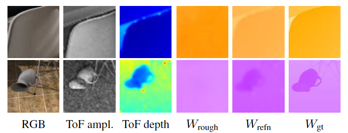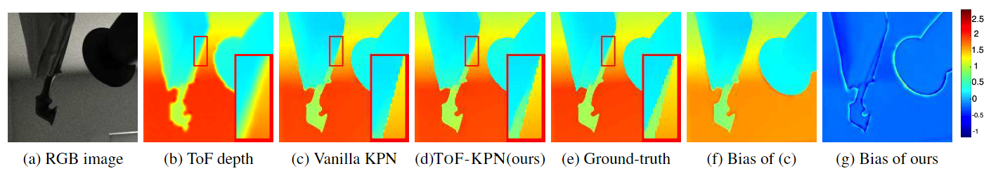(ii) 对于 ToF 深度细化问题,我们提出了一种有效的架构 ToF 内核预测网络 (ToF-KPN),它也使用了 RGB 图像。通过对原始KPN的简单更改,我们在提高深度质量的同时,在降低MPI方面实现了最先进的性能。
