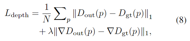 深度细化。选择合适的损失函数对于在没有MPI的情况下学习正确的几何图形和来自RGB图像的不相关纹理至关重要。该模块使用了输出深度上的ℓ1损失及其梯度。特别是,给定输出深度Dout和相应的groundtruth深度Dgt,其相关损失为