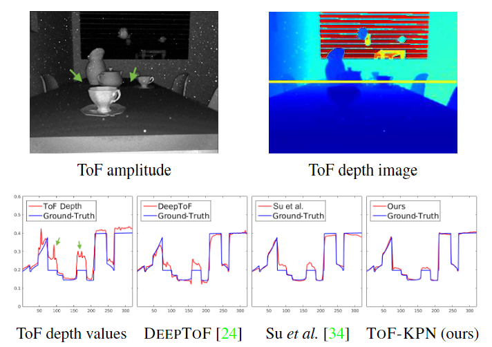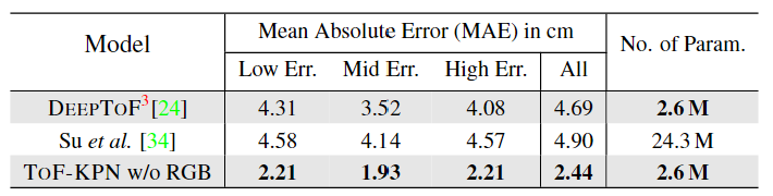 ToF-FlyingThings3D 的实验。我们将我们的建议与其他两种代表性方法进行比较。第一个是Su等人[34]提出的深度端到端ToF管道,它将原始相关测量作为输入。在实验中,我们直接使用他们发布的模型,因为我们的 ToF-FlyingThings3D 数据集是使用与 [34] 相同的设置生成的。第二个竞争方法是基于自动编码器的 DEEPTOF 框架,它直接处理现成的 ToF 深度图像 [24]。原始 DEEPTOF 采用比我们的模型更小的模型,并在其真实数据集上进行训练。为了公平比较,我们用我们的 U-NETbackbone 替换他们的模型,并在我们的合成数据集上进行训练。我们还将欧几里得范数作为损失函数,如[24]所示。请注意,这两种方法将ToF深度图像和ToF幅度作为输入,即它们不使用RGB图像。为了公平起见,我们训练了TOF-的一个版本不以RGB图像作为输入的KPN。