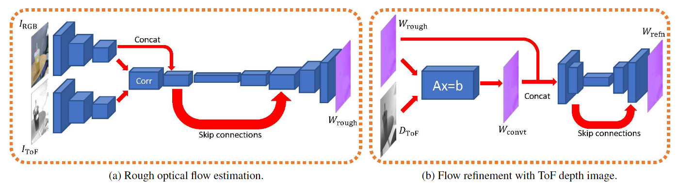 其中 Iwarped(p) 表示图像 I 的第 p = (m, n) 个像素,类似于 I(p); Wx, Wy ∈ Rh×w 是估计的光流的 x 和 y 分量。如(1)所示的翘曲操作相对于翘曲场[19]是可微的。与经典的光流估计方法相比,最近基于卷积神经网络(CNNs)的方法不仅具有较强的学习/适应能力,而且在在多个尺度上利用空间和非局部信息方面也更好[23,9]。因此,我们将匹配任务视为使用 CNN 估计跨模态密集光流。我们将估计任务分为两个阶段:1)粗略的光流Wrough ∈ Rh×w×2 估计,2)流细化。在第一阶段,我们只基于 IRGB 和 IToF 计算流,而在第二阶段,我们利用 ToF 传感器的深度图像来细化流细节。