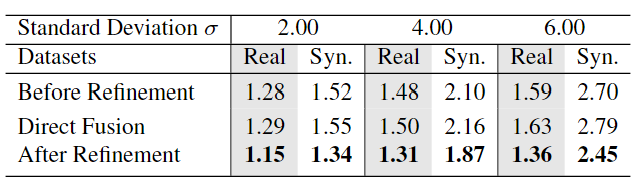 我们首先使用合成数据和真实数据验证了我们的对齐模块的准确性。具体来说,我们应用第 4.2 节中描述的方法从随机采样的相机参数中生成测试数据。为了对不同级别的扰动进行建模,我们生成了 6 组数据,每组数据包含 1000{ToF 幅度、RGB、ToF 深度} 三元组以及地面实况流,其中扰动是从正态分布中采样的,标准偏差增加。我们的实验表明,流细化模块始终可以提高准确性(表 1)。我们还定性地展示了图 5 中流细化的效果。