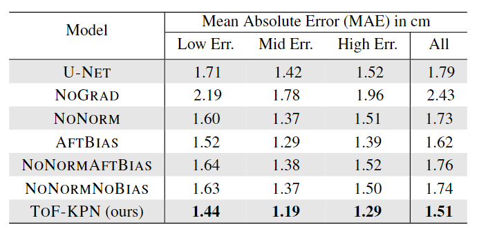 我们首先观察到我们的TOF-KPN在所有误差级别上提供了最好的MAE。通过比较TOF-KPN和 NOGRAD,我们注意到最大增益来自加权梯度损失,而不会导致 MAE 增加至少 60.9%。在相同的损失函数下,不同的模型架构也会导致不同的性能。行为最差的 KPN 变体是 NONOR-MAFTBIAS,即 vanilla KPN (4),它们既没有核归一化,也没有首先添加偏差。对于这个模型,我们凭经验发现偏差很快占主导地位,而内核在训练期间退化为零。因此,网络的行为与 U-NET 非常相似,如第 3.2 节所述。为了减轻这种现象并充分利用 KPN 的力量,可以使用核归一化或事先应用偏差,导致 MSE 略小(AFTBIAS 和 NONORM)。然而,我们进一步注意到,对于 NONM,偏置项的贡献很小,因为它的性能与没有偏置项的模型相似,即 NONORMNOBIAS。执行核归一化并首先添加偏差,因为我们的 TOFKPN 导致最佳性能,比第二好的模型 AFTBIAS 有 6.8% 的显着优势。非ORFTBIAS和TOF-之间的主观比较KPN 也显示在图 6 中,其中 NONORMAFTBIA 具有主导偏差,而我们的 TOF-KPN 给出了更忠实的结果。