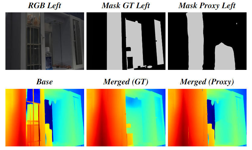 虚拟视差生成替代方案。我们询问两个主要的替代方案来生成虚拟:i)虚拟视差:根据材料分割掩码屏蔽左右图像——因为只为左侧图像提供材料注释,我们根据地面真实视差将其扭曲到右侧图像上——然后用立体网络处理两者,我们要微调类似于单目网络,ii)合并:将立体模型本身产生的视差标签与原始DPT权重[36]生成的视差标签合并,如式4所示。虽然前者可能看起来是我们提议从单目到立体情况的自然扩展,但我们将证明其无效。