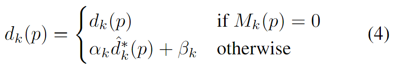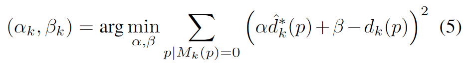其中 αk、βk 是尺度和移位因子,因为单目预测最多是一个未知的比例因子。在[37]之后,αk, βk通过对dk的最小二乘估计(LSE)回归来估计,对于不属于任何ToM对象的像素,即Mk(p)=0: