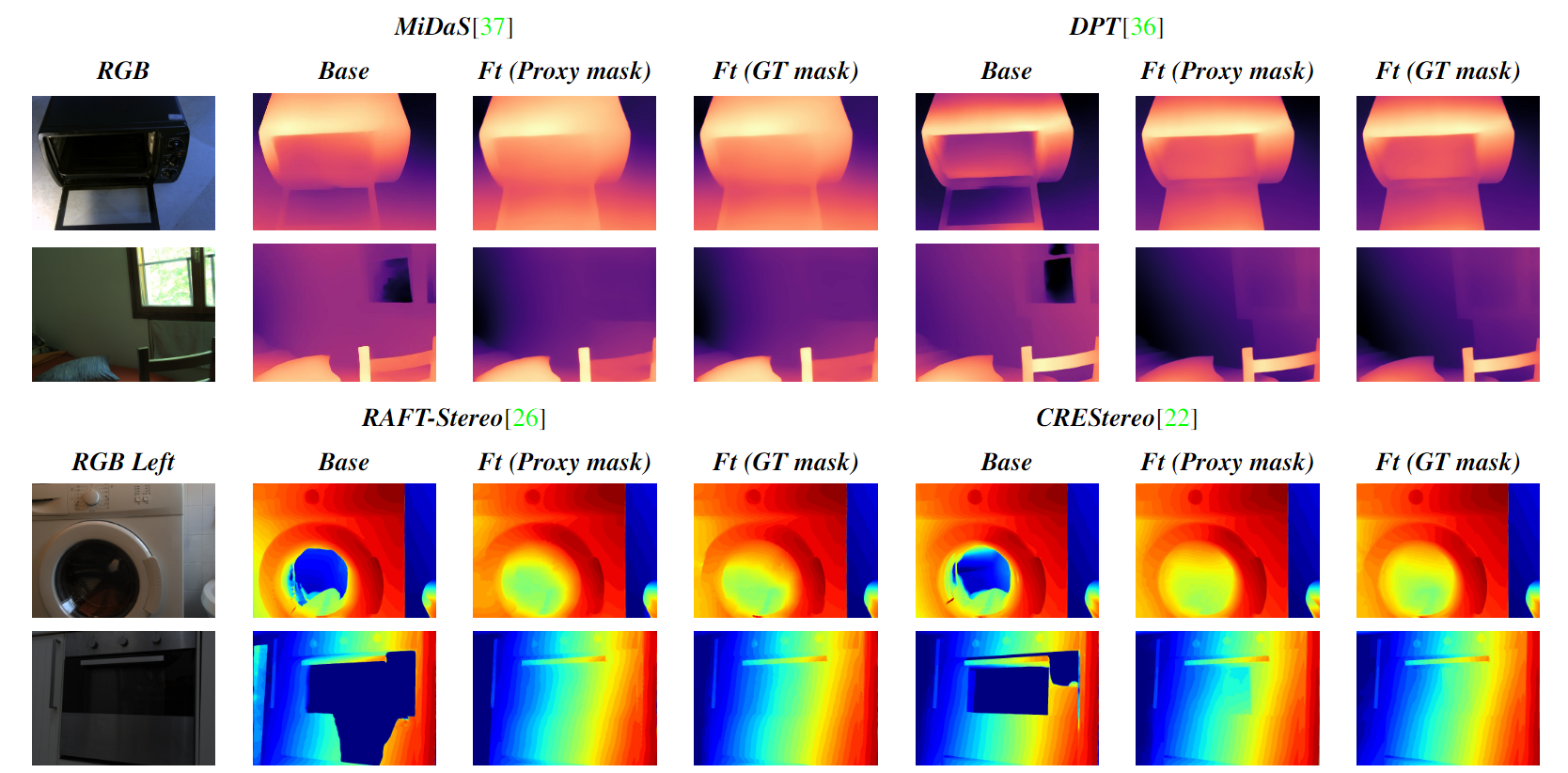 我们得出结论,图 8 显示了根据我们的建议进行微调的效果,分别从 Booster 训练集和测试集中有两个单目(顶部)和立体(底部)网络的示例。我们强调了 MiDaS、DPT、RAFT-Stereo 和 CREStereo 如何学会在依赖神经网络提供的代理分割掩码或人类准确注释时处理 ToM 表面。补充中的更多定性。