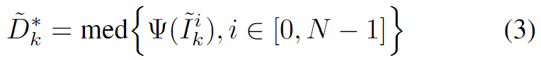 然后,通过将 ̃Ik 转发到单目深度网络 Ψ 作为 ̃Dk = Ψ( ̃Ik),得到图像 Ik 的虚拟深度 ̃Dk。为每个单帧Ik随机采样颜色。然而,根据图像内容,某些颜色可能会导致无效并增加场景的歧义——例如,通过将白色像素涂成位于白色墙前面的透明对象。为了阻止这些出现,我们使用这些自定义颜色中的每一个对一组 N 个自定义颜色 ci, i ∈ [0, N -1] 和 in-paint Ik 进行采样,从而生成一组 N 个增强图像 ̃Ii k。然后,我们通过计算N个深度图之间的逐像素中值来获得最终的虚拟深度̃Dk