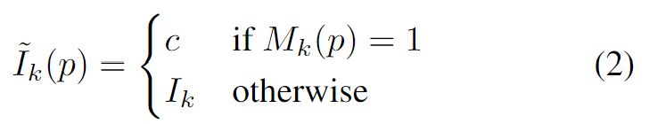 修复和蒸馏。给定一个图像Ik及其对应的分割掩码Mk,我们生成一个增强图像̃Ik,应用in-painting操作将属于ToM对象的像素替换为颜色c: