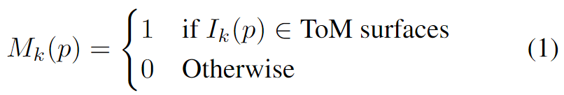 如果像素分别属于 ToM 表面,则通过将像素标记为 1 或 0。这样的分割掩码可以通过手动注释或通过分割网络 Θ 作为 Mk = Θ(Ik) 获得。