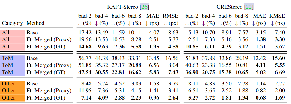 评估协议。我们使用几个指标来评估单目网络的准确性,包括相对于真实值 (ABS Rel.) 的绝对误差,预测/ground-truth 和 ground-truth/prediction 比率之间的最大像素百分比低于阈值(δi,其中 i 为 1.05、1.10、1.15、1、220 和 1.25)、平均绝对误差 (MAE) 和均方根误差 (RMSE)。此外,我们使用Booster[63]中定义的指标来评估立体网络,即bad-2、bad-4、bad-6、bad-8、MAE、RMSE。结果报告在所有有效像素(All)或属于 ToM 或其他对象的像素上,以评估我们的策略对不同类型表面的影响。对于为立体网络考虑的任何指标,越低越好——在表中用↓注释。这同样适用于单目网络的指标,除了 δi,导致更高的、更好的——表中报告了 ↑。由于单目网络的预测最多是一个未知的比例因子,我们根据Eq. 5中定义的[37]的LSE准则对它们进行缩放,但这里使用所有有效像素。单目网络在 Booster 训练集上进行了评估,而立体模型在 Booster 测试集上进行了评估。至于后者,根据我们定义的分割类,Booster 作者对分为“ToM”和“Other”对象的结果进行了类型计算