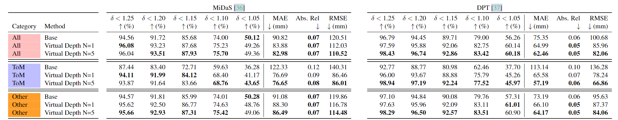 In-Paintings的数量。我们通过改变 N 来研究虚拟深度标签的质量。当使用 N = 1 时,我们生成单个未绘制的图像,该图像被转发到单目网络,而在 N = 5 时,我们从 5 个不同颜色的蒙版图像生成虚拟深度,然后通过逐像素选择聚合深度中位数。在表1,我们报告了两种策略产生的深度图的准确性,以及基本架构的准确性,即不应用任何修复策略。首先,使用 MiDaS 和 DPT,两种修复策略都获得了对 TOM 区域更准确的虚拟深度,即基本架构。其次,N=5 图在大多数指标中产生了稍好的结果,尤其是在查看 DPT 性能时。我们将其归因于第二种策略更高的鲁棒性。对于剩余的实验,我们固定 N = 5,因为我们没有观察到更大的值有任何进一步的改进。