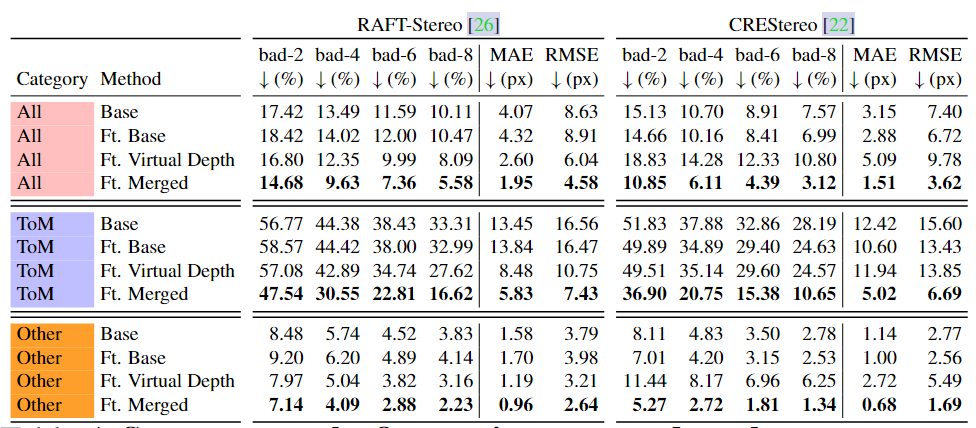 微调结果(GT 分割)。表4 通过我们的技术微调 RAFT-Stereo 和 CREStereo 获得的结果。从顶部到底部,我们报告了原始模型 (Base) 获得的结果以及根据自己的预测进行微调的实例 (Ft.Base) 或根据两种策略获得的伪标签 (Ft.虚拟深度Ft。合并)。