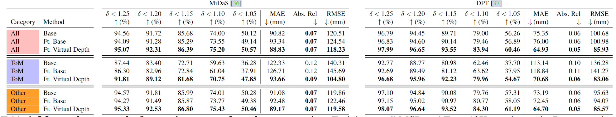 微调结果(GT 分割)。在表2,我们报告了Booster训练集的结果,在对来自Trans10K的所有可用数据进行微调MiDaS和DPT后获得和MSD。在 Base 行,我们使用官方发布的权重报告网络的结果,无需任何进一步的训练,并与 Ft 行的结果进行比较。虚拟深度,即我们方法的结果。我们注意到,我们的方法提高了所有像素的准确性。特别是,我们在 MiDaS [37] 的 ToM 表面的性能显着提高,MiDaS [37] 的 DPT[37] 的 4.37、5.72、8.97、111.112 和 11.57%、28.67mm、0.03%、35.51mm 和 3.91、7.19、11.25、16.8 和 16.97%、42.46mm、0.04%、53.255mm,δ1.25、δ1.20、δ1.15、δ1.15、δ1.10、δ1.05、MAE、Abs。Rel 和 RMSE 分别。我们强调,在微调期间,ToM 的准确度仅略低于 Other。此外,类 Other 指标也稍好一些,可能是因为网络提取的特征增强,可以更好地理解场景上下文。最后,我们在 Ft 中报告。基于在没有任何修复策略的情况下,通过自行预测对网络进行自我训练获得的微调结果。正如预期的那样,如果没有适当的虚拟深度标签,网络不能有效地从新数据集中学习,产生的结果与 Base 架构相当。对其他数据集的实验在附录中。